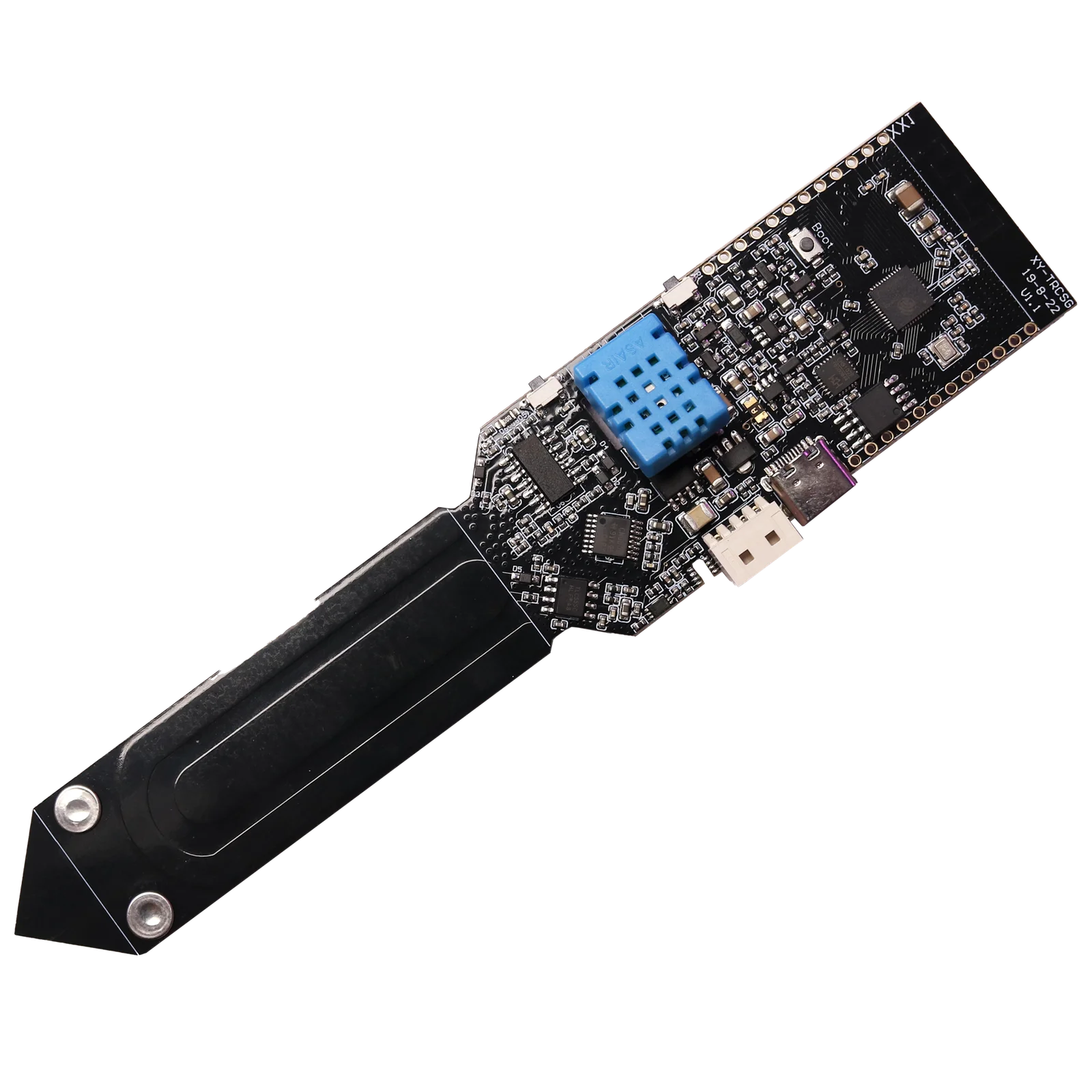 This product comes with Wifi Bluetooth Humidity Photometric Electrolyte Sensor Unsoldered. The capacitive soil moisture sensor differs from most of the resistive sensors on the market, using the capacitive sensing principle to detect soil moisture. It avoids the problem that the resistance sensor is easy to corrode and greatly prolongs its working life.S18B20 waterproof temperature sensor is used for this product and t-watch with the t-grove interface. For example, it can be used to test the temperature and humidity of flowerpot soil and environment, as well as the water temperature of fish tanks when raising fish.