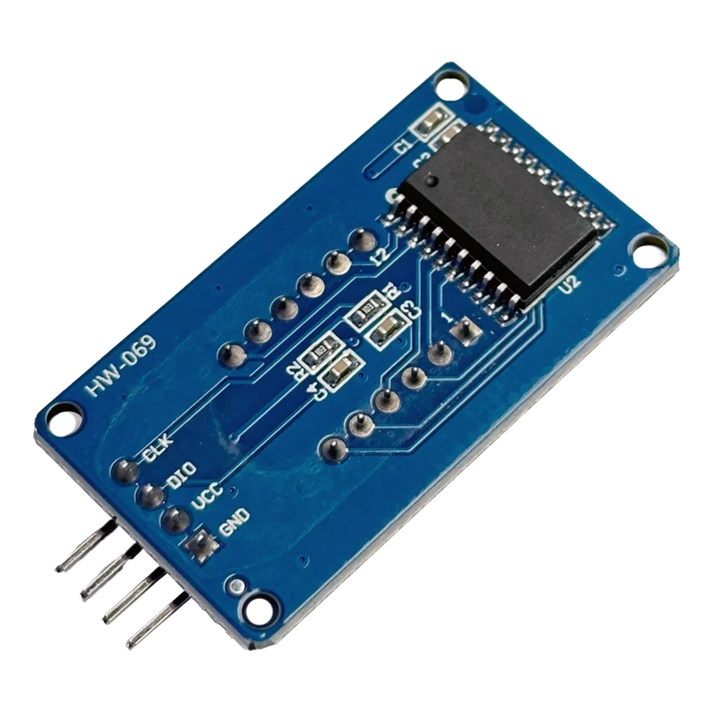 There are several modules using this TM1637 chip to form a 4 digit numerical display module. TM1637 has also keyboard input capability but is not used in this module.